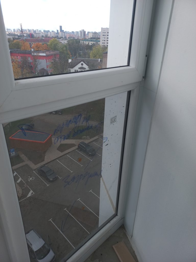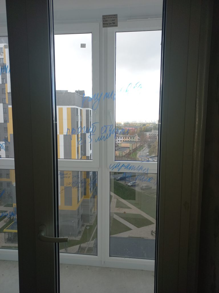 На окнах загрязнения и повреждения пластикового профиля. Трещины элементов оконных изделий. Царапины на стеклопакетах, отливах. Окна не отрегулировали. Створки окон и дверей лоджии просели, открываются с заеданиями. Фурнитура работает не корректно. Зазоры в местах угловых соединений элементов окон больше допустимых. Загрязнение окон клеевым цементным составом снаружи и внутри.