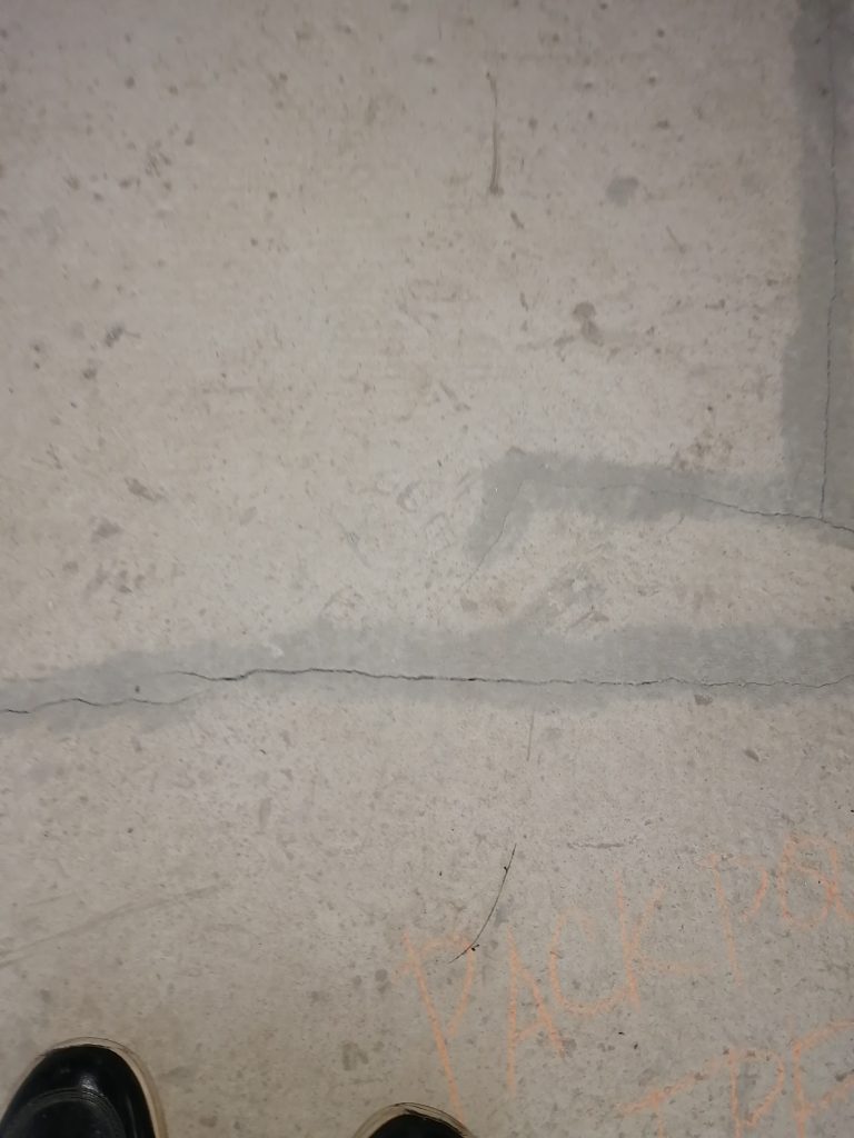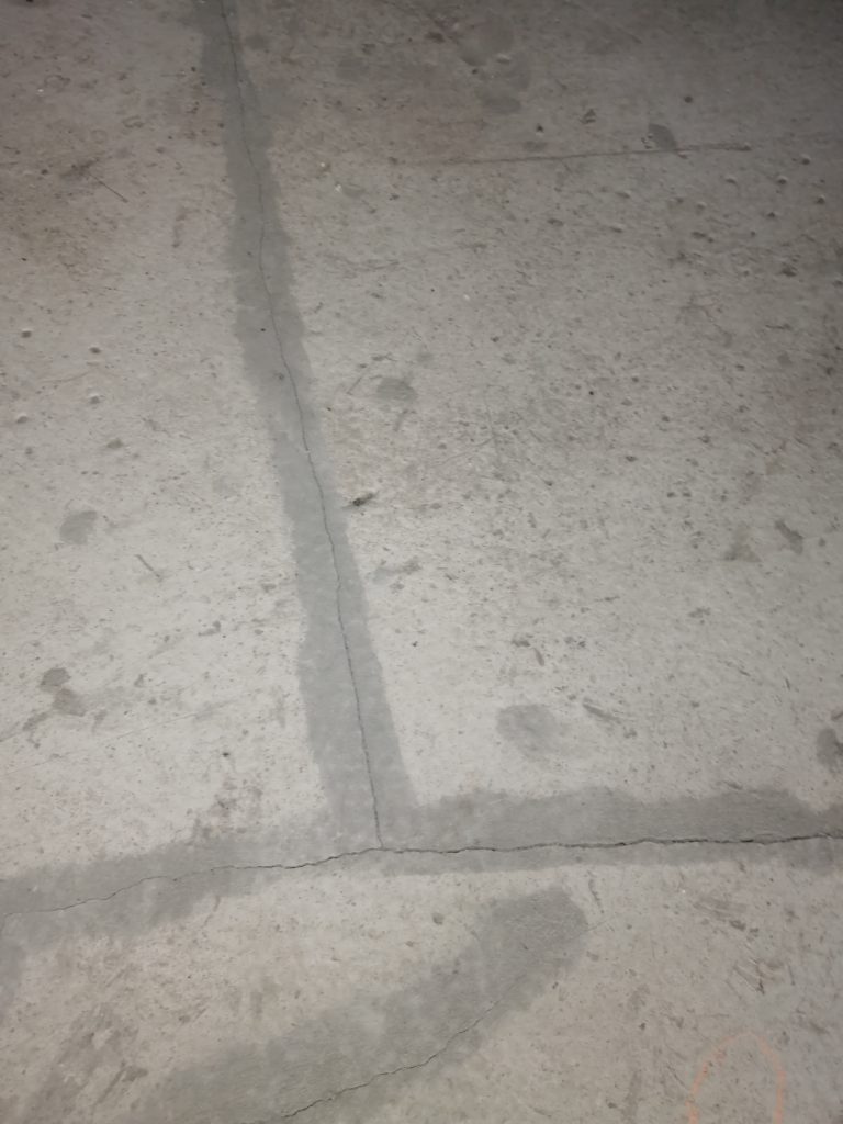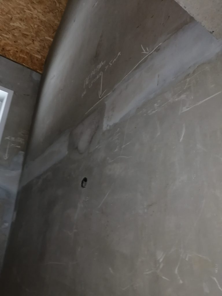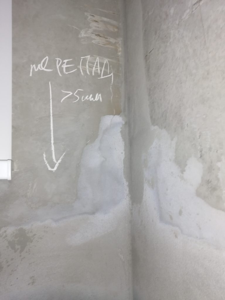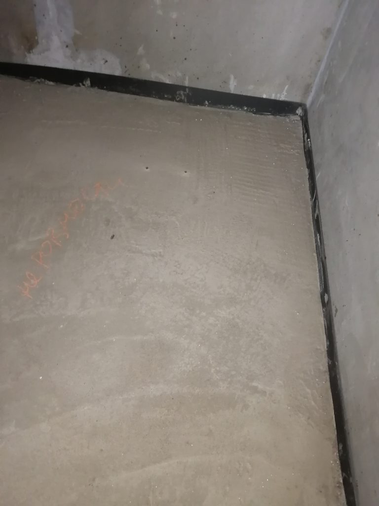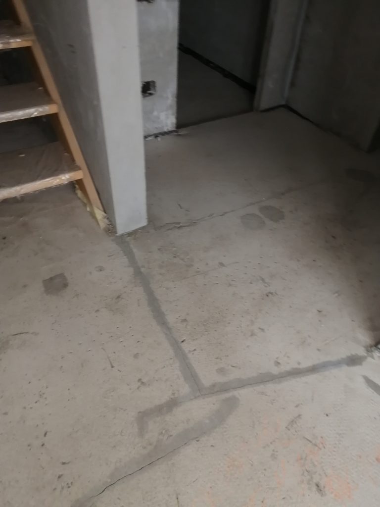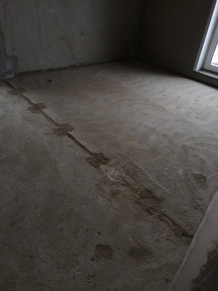 Стяжку выполнили не аккуратно и не ровно, с множеством раковин, она растрескалась. Демпферный шов частично залили раствором.