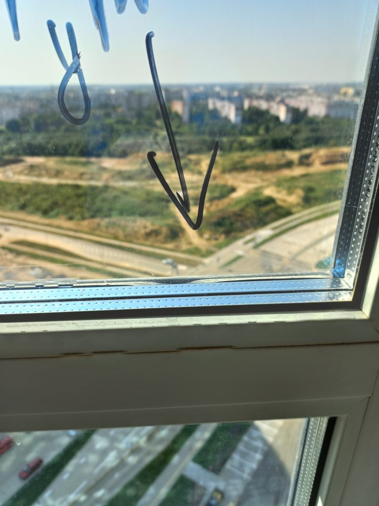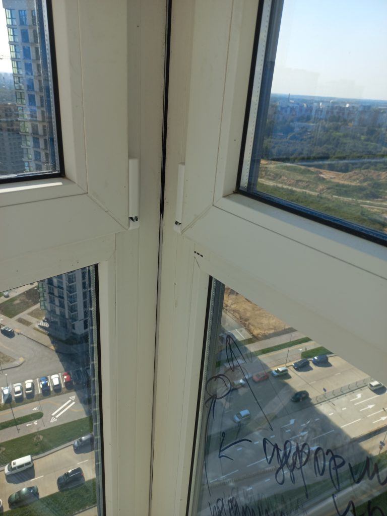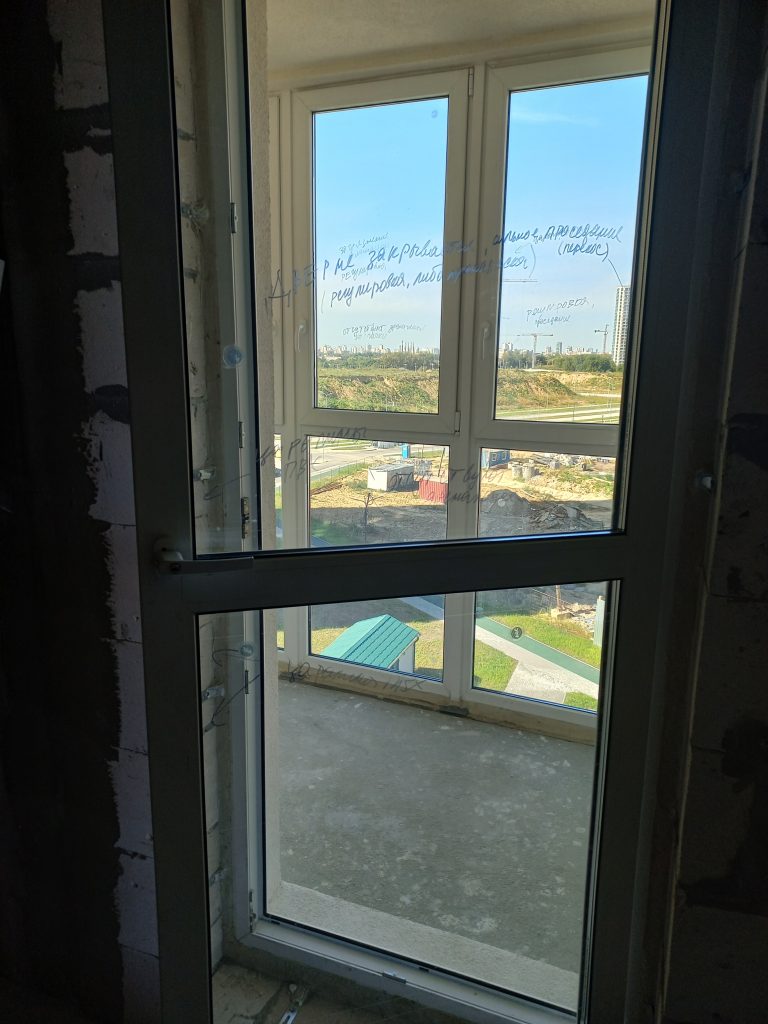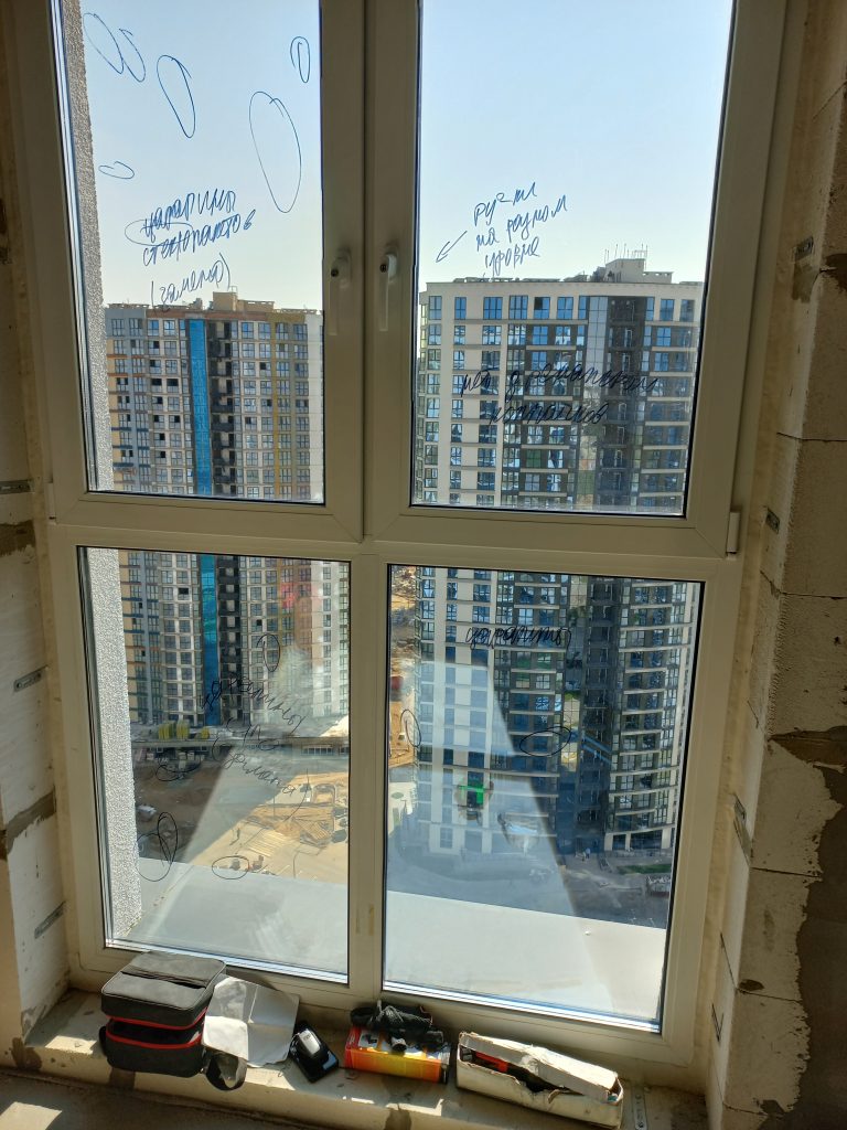 При осмотре окон выявили царапины, загрязнения профиля, отливов и стеклопакетов. С окон не снята защитная пленка. Необходима регулировка окон. Деформация оконного уплотнителя. Щели в местах стыковки элементов окон. Не выполнили герметизацию отливов. Контруклон отливов.