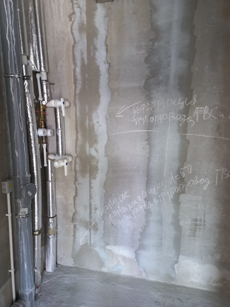 На радиаторах царапины. Трубопровод горячего и холодного отопления выполнен с отклонениями в местах крепления, превышающими допустимые значения. Отводы канализации упираются в рядом стоящий трубопровод и задействовать их без внесения конструктивных изменений не получится.
