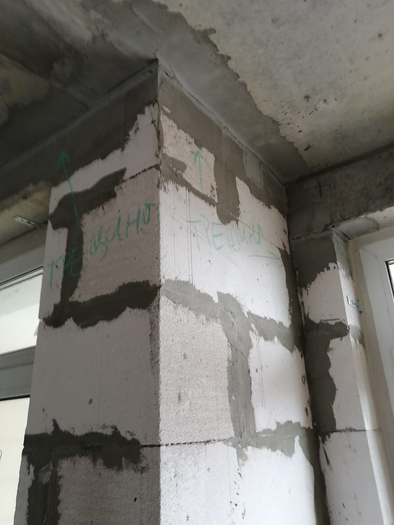 На перегородках имеются трещины, с наибольшей локализацией в местах примыкания стен к перекрытиям и в верхних углах проемов. Отклонение монолитных участков стен по вертикали и перемычек над окнами по горизонтали до 3 см.