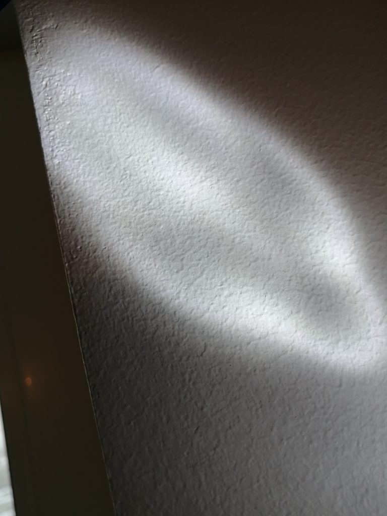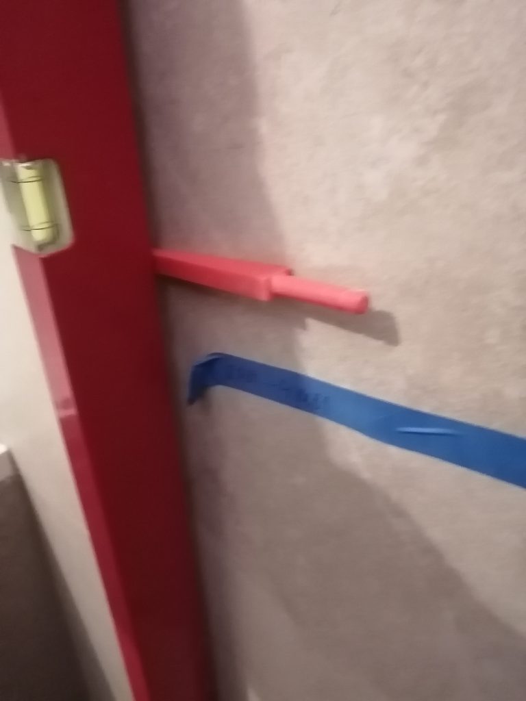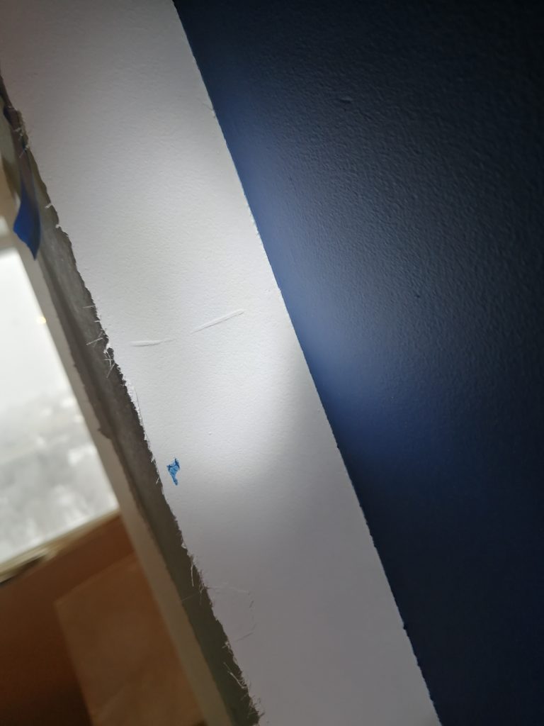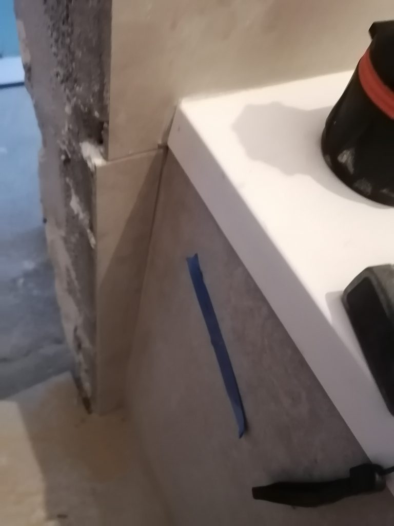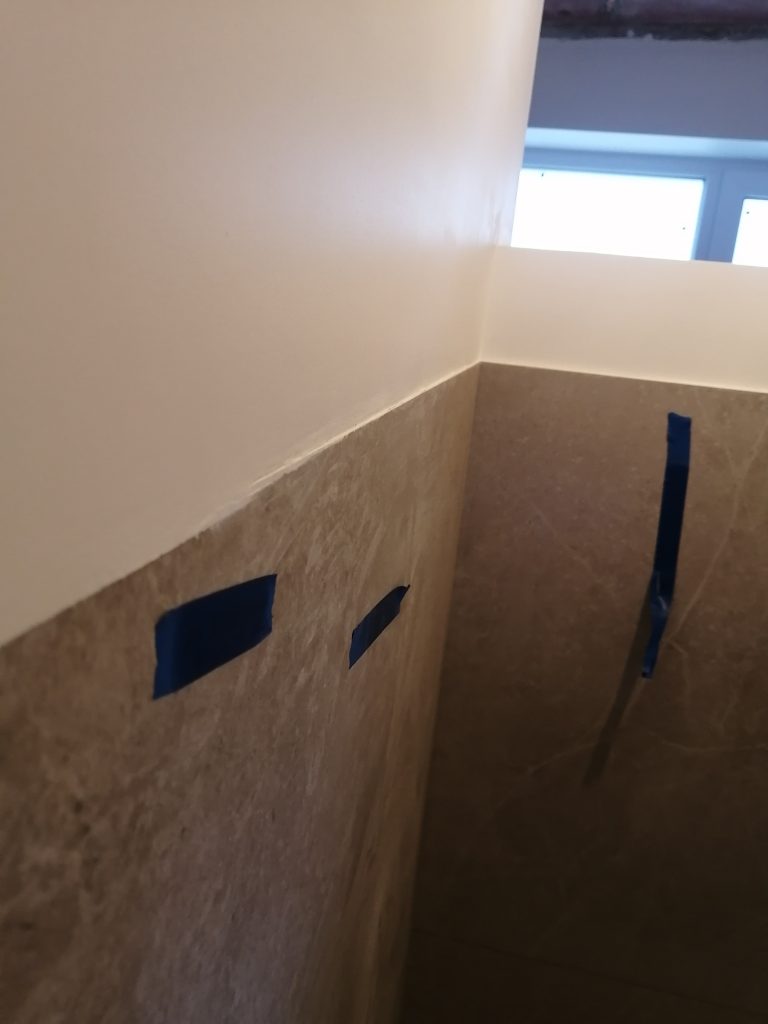 Стык плитки с окрашенной поверхностью выполнили то же не ровно. Так, с одной стороны простенка в плоскости, с другой – перепад (выступ) 5 мм. Стык поверхностей выполнили не ровно.