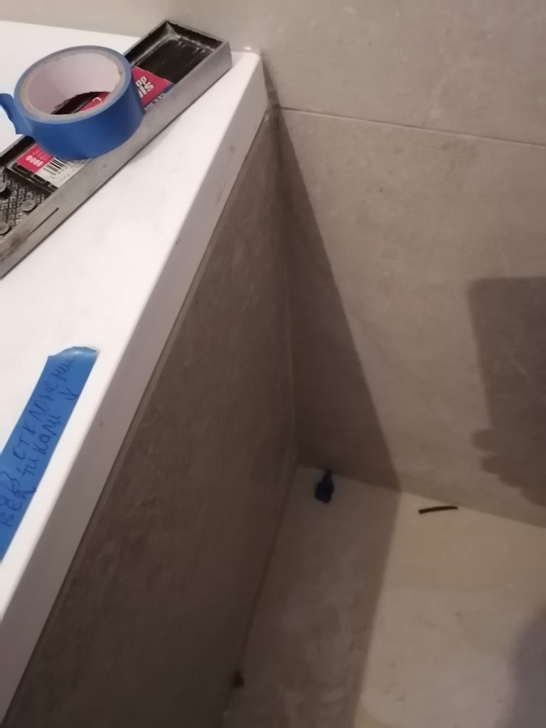 Зашивка ванной еще имеет отклонения в горизонтальной плоскости. С одной стороны ванной экран завели под ванну, а с другой (со стороны смесителя) выступает за плоскость ванной. Кроме нарушения геометрии, это приведет к постоянному попаданию воды и разрушению слоя основания. Со слов владельца квартиры в качестве основания применили обычный не влагостойкий гипсокартон, что также недопустимо в помещениях с влажным процессом.
