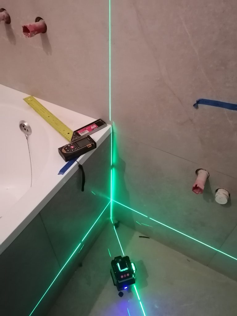 Начали осматривать облицовку плиткой. Прикладываем уровень и видим отклонения от ровности до 4 мм на 1 м, что превышает допустимые значения.Проверили лазерным уровнем соблюдение плоскостей и линий швов. Выявили существенные отклонения от вертикальной плоскости.