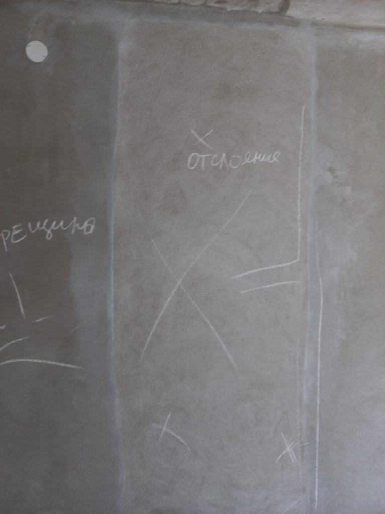 На стенах обнаружили, отклонения от вертикали, много отслоений штукатурного слоя, трещин и  неровностей больше допустимых значений.