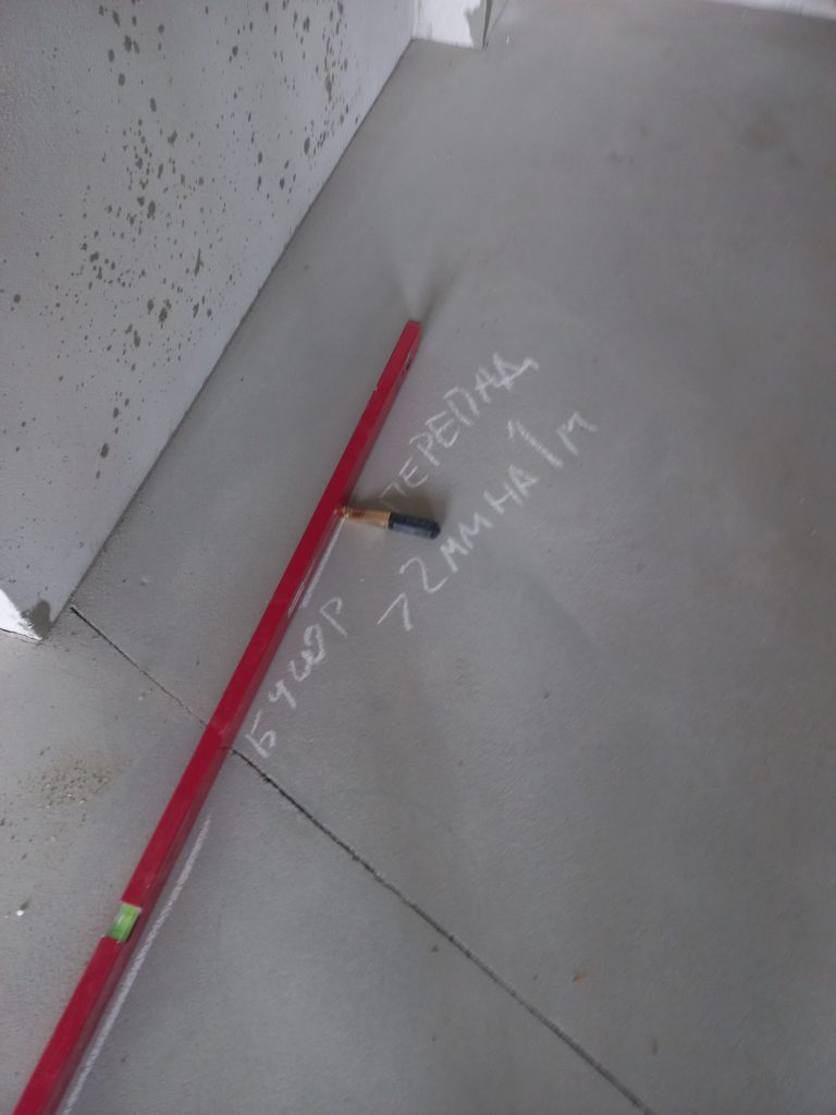 Осмотрели стяжку пола, выявили локальные неровности, превышающие допустимые значения трещины. Перепады до 4 миллиметров на 1 метр, что в 2 раза превышает допустимые значения.