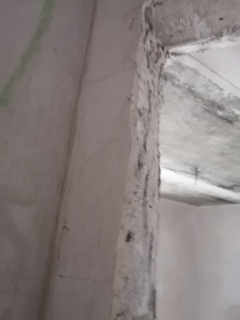 Дефекты штукатурного слоя на практически на всей поверхности перегородок, откосах и простенках.