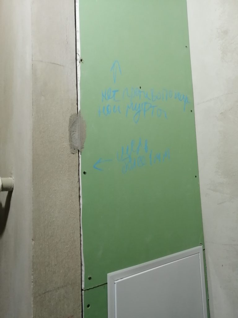 Качество выполнения зашивок из гипсокартона также оставляет желать лучшего (при стыковке листов щели 5-7мм). Коммуникации по зашивкой надлежащим образом не закрепили.